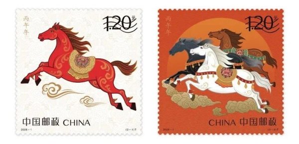 《丙午年》特种邮票由王红卫、赵恩重设计。邮票第一枚图名为“驰跃宏图”,以“腾跃新时代”为核心意象,展现了一匹红马奔驰于祥云之上,鬃毛如焰,四蹄生风;第二枚图名为“万骏臻福”,以“万马奔腾,驰骋千里”为核心意象,展现了三匹奔跑的骏马,三为众,寓意奔腾不息、共同奋进。图案背景及马身辅以祥云纹、火焰纹、缠枝纹等传统吉祥纹样,既隐喻福运连绵,亦强化东方美学底蕴。邮票中的骏马既展现出“一马当先”的开拓气概,也诠释了“万马奔腾”的团结力量,将马的形象与新时代中国人民奋发进取的精神风貌完美融合于方寸之间。